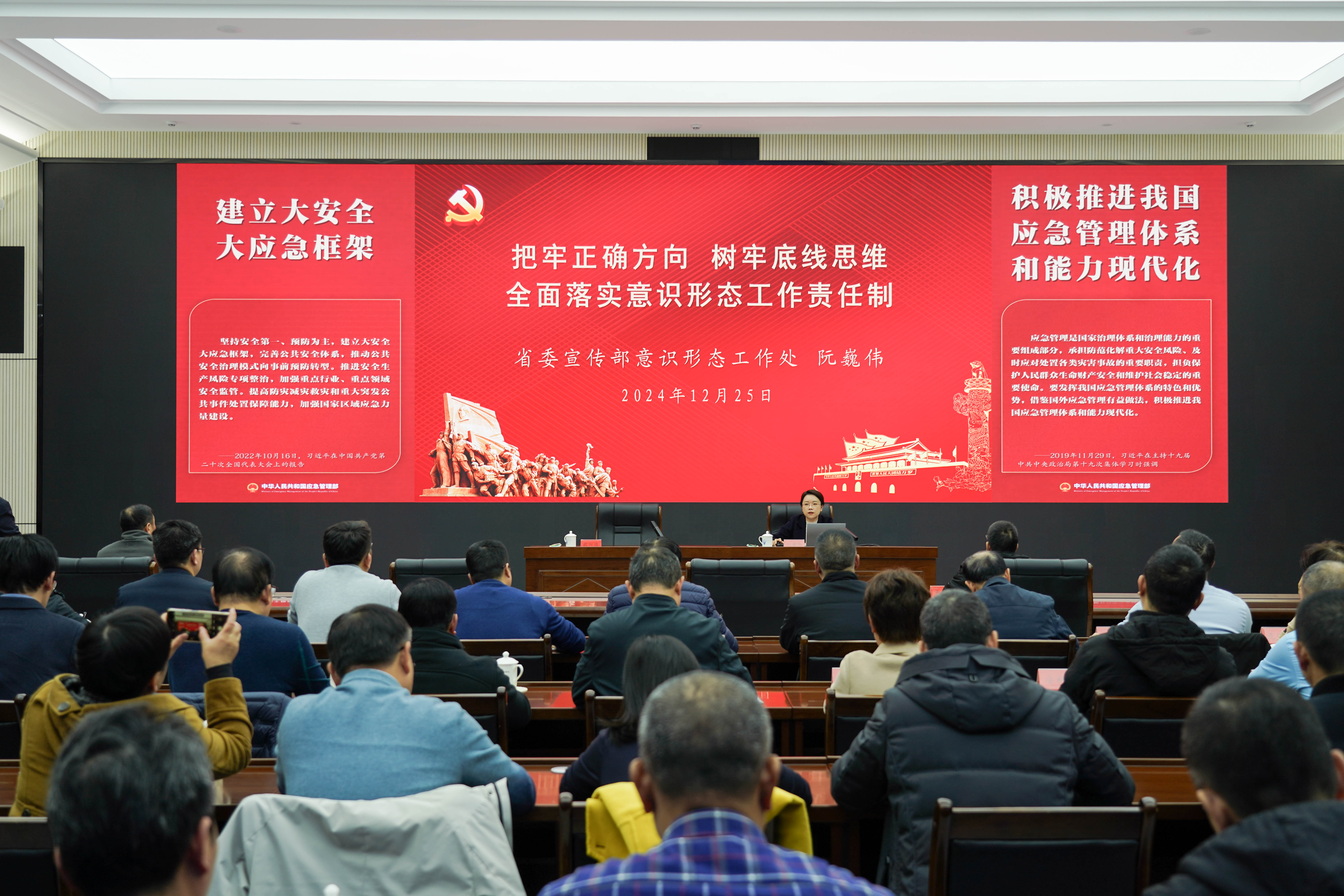 12月25日,省应急管理厅党委召开理论学习中心组(扩大)学习会暨意识形态专题讲座,邀请省委宣传部意识形态工作处处长阮巍伟作《把牢正确方向,树牢底线思维,全面落实意识形态工作责任制》专题讲座。厅领导班子成员、驻厅纪检监察组和厅机关全体干部、直属单位领导班子成员和中层以上干部参加。