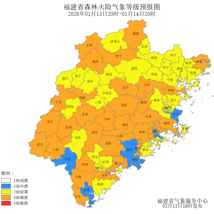 今天晚上到明天白天,宁德市、平潭的森林火险气象等级为较高危险(三级),莆田市、南平市、福州市、厦门市、泉州市、漳州市、龙岩市、三明市的森林火险气象等级为高度危险(四级),其中,鼓楼区、台江区、仓山区、马尾区、晋安区、闽侯县、连江县、思明区、湖里区、蕉城区、福安市、霞浦县、屏南县、寿宁县、周宁县、柘荣县、秀屿区、鲤城区、泉港区、惠安县、芗城区、龙文区、漳浦县、华安县、长泰区、新罗区、清流县、沙县区、将乐县、泰宁县、建宁县、武夷山市、建瓯市、顺昌县、松溪县、政和县、平潭、三元区的森林火险气象等级为较高危险(三级),福清市、光泽县、闽清县、永泰县、海沧区、集美区、同安区、翔安区、福鼎市、古田县、城厢区、涵江区、仙游县、丰泽区、洛江区、安溪县、永春县、德化县、龙海市、诏安县、南靖县、平和县、漳平市、长汀县、上杭县、武平县、连城县、永安市、明溪县、宁化县、大田县、尤溪县、延平区、建阳区、邵武市、浦城县、罗源县的森林火险气象等级为高度危险(四级)。