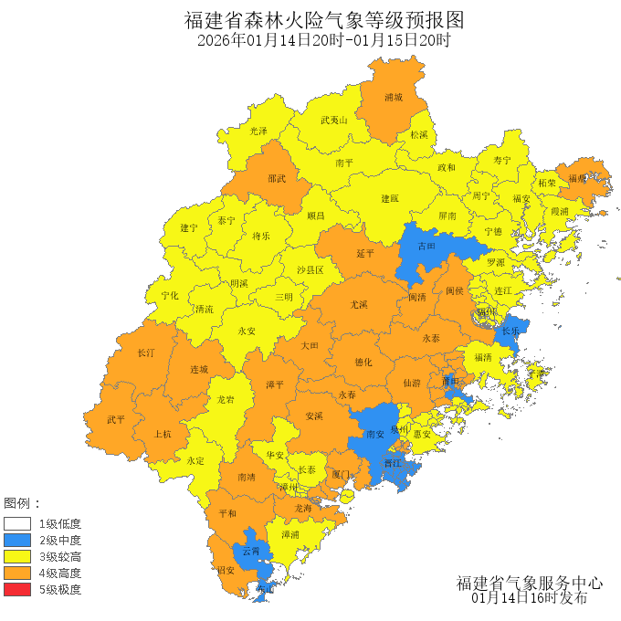 今天晚上到明天白天,福州市、宁德市、平潭的森林火险气象等级为较高危险(三级),莆田市、南平市、厦门市、泉州市、漳州市、龙岩市、三明市的森林火险气象等级为高度危险(四级),其中,鼓楼区、台江区、仓山区、马尾区、晋安区、福清市、连江县、罗源县、思明区、湖里区、蕉城区、福安市、霞浦县、屏南县、寿宁县、周宁县、柘荣县、秀屿区、鲤城区、洛江区、泉港区、惠安县、芗城区、龙文区、漳浦县、华安县、长泰区、新罗区、永定区、永安市、明溪县、清流县、宁化县、沙县区、将乐县、泰宁县、建宁县、建阳区、武夷山市、建瓯市、顺昌县、光泽县、松溪县、政和县、平潭、三元区的森林火险气象等级为较高危险(三级),闽侯县、浦城县、永泰县、海沧区、集美区、同安区、翔安区、福鼎市、城厢区、涵江区、仙游县、丰泽区、安溪县、永春县、德化县、龙海市、诏安县、南靖县、平和县、漳平市、长汀县、上杭县、武平县、连城县、大田县、尤溪县、延平区、邵武市、闽清县的森林火险气象等级为高度危险(四级)。