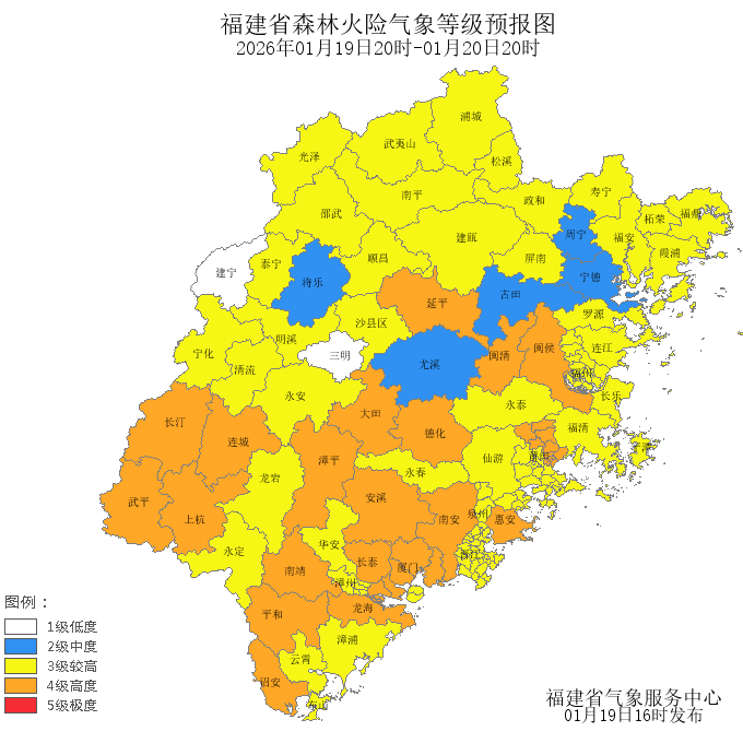 今天晚上到明天白天,福州市、莆田市、平潭、宁德市、三明市的森林火险气象等级为较高危险(三级),南平市、厦门市、泉州市、漳州市、龙岩市的森林火险气象等级为高度危险(四级),其中,鼓楼区、台江区、仓山区、马尾区、晋安区、福清市、长乐区、连江县、罗源县、永泰县、思明区、湖里区、福安市、福鼎市、霞浦县、屏南县、寿宁县、柘荣县、城厢区、荔城区、秀屿区、仙游县、鲤城区、丰泽区、洛江区、泉港区、石狮市、晋江市、永春县、芗城区、龙文区、漳浦县、云霄县、东山县、华安县、新罗区、永定区、永安市、明溪县、清流县、宁化县、沙县区、泰宁县、建阳区、邵武市、武夷山市、建瓯市、顺昌县、浦城县、光泽县、松溪县、政和县、平潭的森林火险气象等级为较高危险(三级),闽侯县、延平区、海沧区、集美区、同安区、翔安区、涵江区、南安市、惠安县、安溪县、德化县、龙海市、诏安县、南靖县、平和县、长泰区、漳平市、长汀县、上杭县、武平县、连城县、大田县、闽清县的森林火险气象等级为高度危险(四级)。