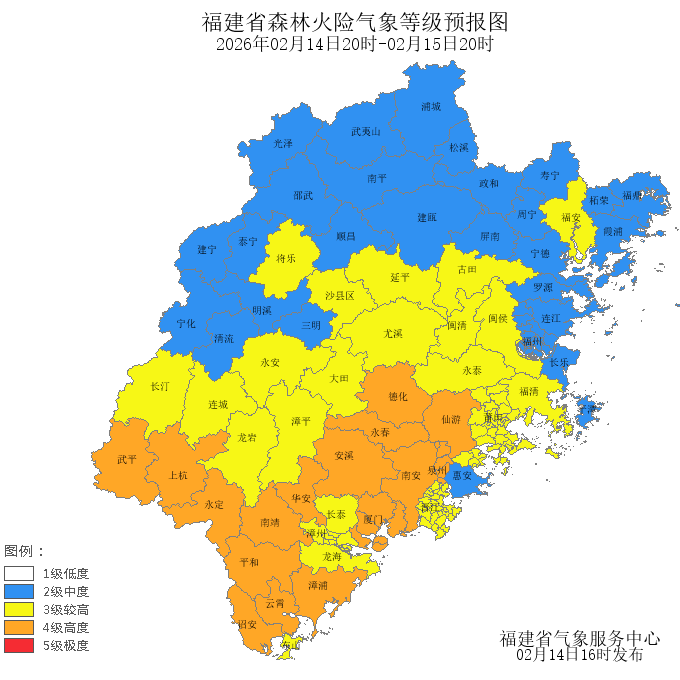 今天晚上到明天白天,莆田市、南平市、福州市、三明市的森林火险气象等级为较高危险(三级),厦门市、龙岩市、漳州市、泉州市的森林火险气象等级为高度危险(四级),其中,漳平市、长汀县、连城县、永安市、大田县、尤溪县、沙县区、将乐县、新罗区、长泰区、东山县、龙海市、龙文区、芗城区、晋江市、石狮市、泉港区、丰泽区、鲤城区、秀屿区、荔城区、涵江区、城厢区、古田县、福安市、永泰县、闽清县、延平区、福清市、闽侯县的森林火险气象等级为较高危险(三级),仙游县、思明区、德化县、永春县、安溪县、南安市、武平县、上杭县、同安区、集美区、永定区、湖里区、洛江区、华安县、平和县、南靖县、诏安县、海沧区、云霄县、漳浦县、翔安区的森林火险气象等级为高度危险(四级)。