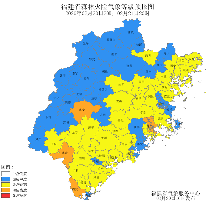 今天晚上到明天白天,福州市、厦门市、宁德市、龙岩市、南平市、三明市、泉州市、漳州市的森林火险气象等级为较高危险(三级),莆田市的森林火险气象等级为高度危险(四级),其中,鼓楼区、台江区、福清市、闽侯县、连江县、罗源县、闽清县、永泰县、思明区、海沧区、湖里区、集美区、同安区、翔安区、蕉城区、福安市、福鼎市、霞浦县、古田县、柘荣县、城厢区、秀屿区、洛江区、晋江市、南安市、安溪县、永春县、德化县、龙海市、漳浦县、云霄县、南靖县、平和县、华安县、长泰区、新罗区、漳平市、上杭县、尤溪县、延平区、政和县的森林火险气象等级为较高危险(三级),涵江区、荔城区、永安市、永定区、诏安县的森林火险气象等级为高度危险(四级)。