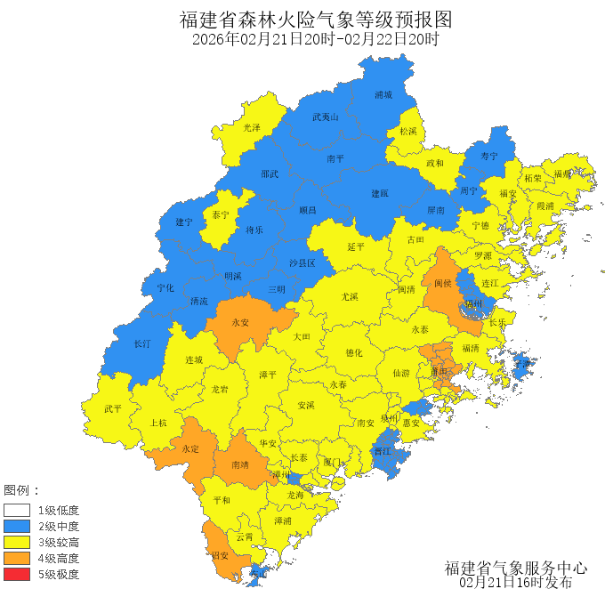 今天晚上到明天白天,福州市、厦门市、宁德市、漳州市、龙岩市、南平市、三明市、泉州市的森林火险气象等级为较高危险(三级),莆田市的森林火险气象等级为高度危险(四级),其中,鼓楼区、台江区、福清市、长乐区、连江县、罗源县、闽清县、永泰县、思明区、海沧区、湖里区、集美区、同安区、翔安区、蕉城区、福安市、福鼎市、霞浦县、古田县、柘荣县、城厢区、秀屿区、仙游县、洛江区、南安市、惠安县、安溪县、永春县、德化县、芗城区、龙海市、漳浦县、云霄县、平和县、华安县、长泰区、新罗区、漳平市、上杭县、武平县、连城县、大田县、尤溪县、泰宁县、延平区、光泽县、松溪县、政和县的森林火险气象等级为较高危险(三级),闽侯县、涵江区、荔城区、永安市、南靖县、永定区、诏安县的森林火险气象等级为高度危险(四级)。