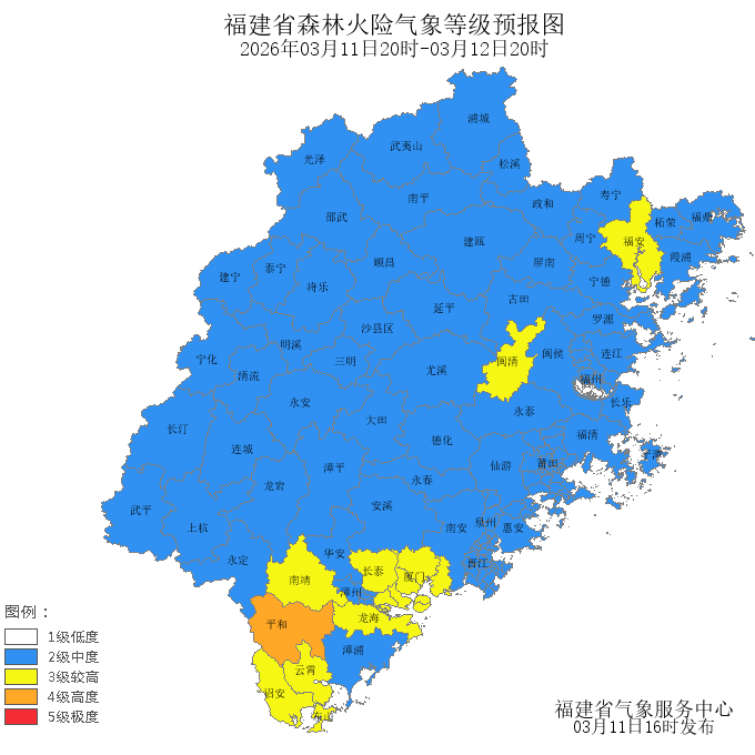 今天晚上到明天白天,厦门市、漳州市的森林火险气象等级为较高危险(三级),其中,长泰区、海沧区、湖里区、集美区、同安区、翔安区、福安市、龙海市、云霄县、东山县、诏安县、南靖县、闽清县、思明区的森林火险气象等级为较高危险(三级),平和县的森林火险气象等级为高度危险(四级)。